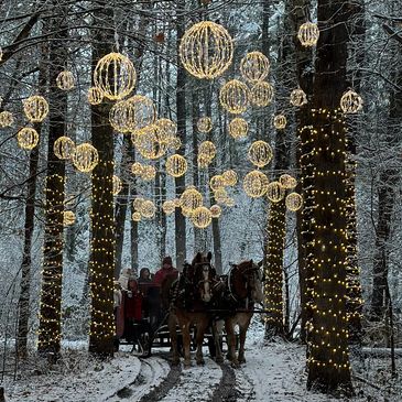 Ride along a 1.5-Mile trail decorated with lights & kerosene lanterns, in a custom made Austrian Sleigh