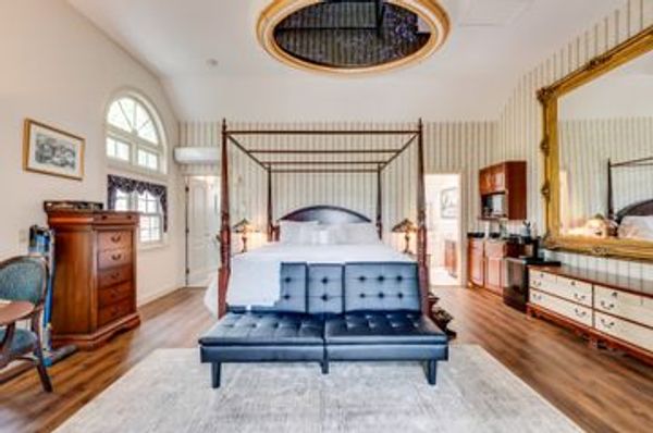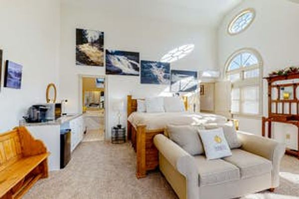 Cozy 2nd floor suite with cathedral ceilings, king bed, large jetted tub, & enclosed balcony with